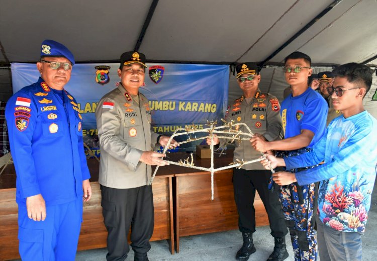 Kupang — Usai meresmikan lampu penerangan jalan umum (PJU) di empat titik strategis, Kapolda Nusa Tenggara Timur Irjen Pol Dr. Rudi Darmoko, S.I.K., M.Si. melanjutkan rangkaian kegiatannya di Mako Ditpolairud Polda NTT dengan melakukan aksi pelestarian lingkungan bawah laut melalui transplantasi terumbu karang. Kegiatan ini diikuti oleh Irwasda Polda NTT, para Pejabat Utama Polda NTT, serta dua komunitas pencinta dan pelestari laut: Komunitas Anana Laut dan Komunitas Beta Cinta Laut.