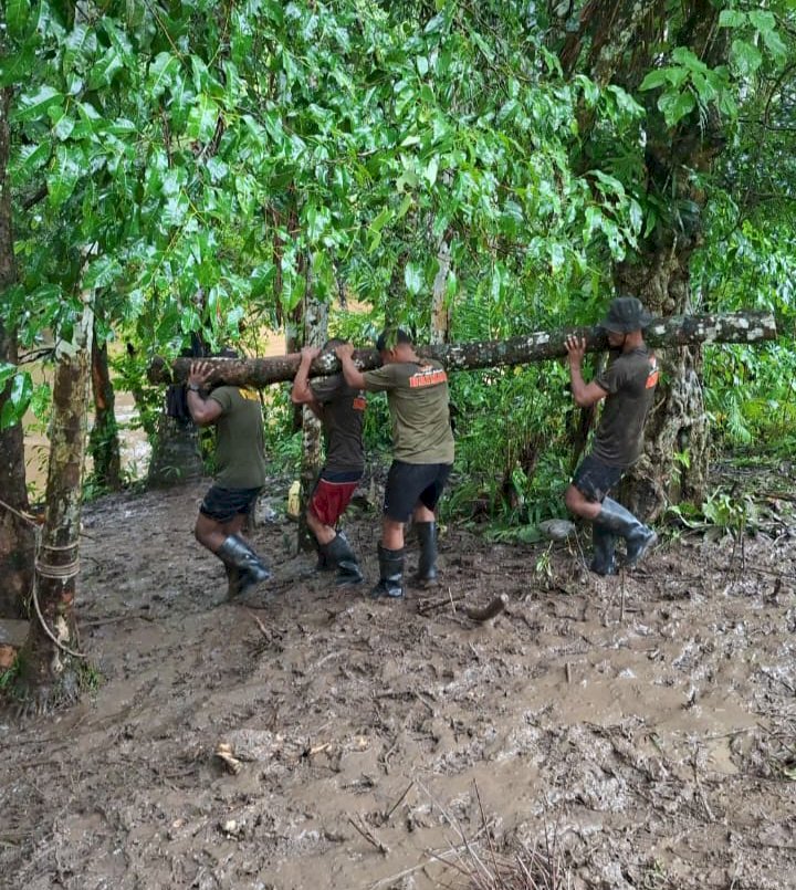 Selanjutnya pukul 09.15 WITA, personel bergerak menuju Desa Dikira menggunakan kendaraan dinas 1 unit D-Max, 1 unit Maung, dan 1 unit truk Isuzu. Setibanya di lokasi pada pukul 10.10 WITA, personel langsung bergabung dengan masyarakat untuk memulai pengerjaan jembatan darurat.