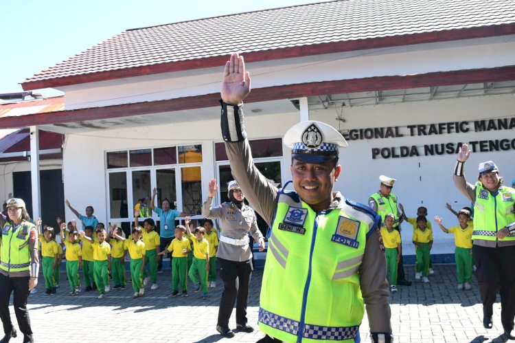 Kupang – Suasana berbeda terlihat di Kantor Direktorat Lalu Lintas (Ditlantas) Polda NTT, Jumat pagi (24/4/2026). Puluhan anak dari TK Negeri Pembina Kupang tampak ceria dan penuh rasa ingin tahu saat berkunjung dalam program edukatif Polisi Sahabat Anak (PSA).
