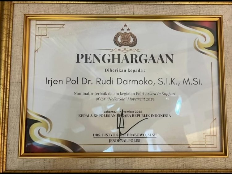 Kupang — Kapolda Nusa Tenggara Timur, Irjen Pol Dr. Rudi Darmoko, S.I.K., M.Si., kembali menorehkan prestasi membanggakan. Ia terpilih sebagai Nominator Terbaik dalam ajang Polri Awards in Support of UN “HeForShe” Movement 2025, sebuah penghargaan bergengsi yang diserahkan langsung oleh Kapolri Jenderal Polisi Drs. Listyo Sigit Prabowo, M.Si pada Kamis (27/11/2025) malam.
