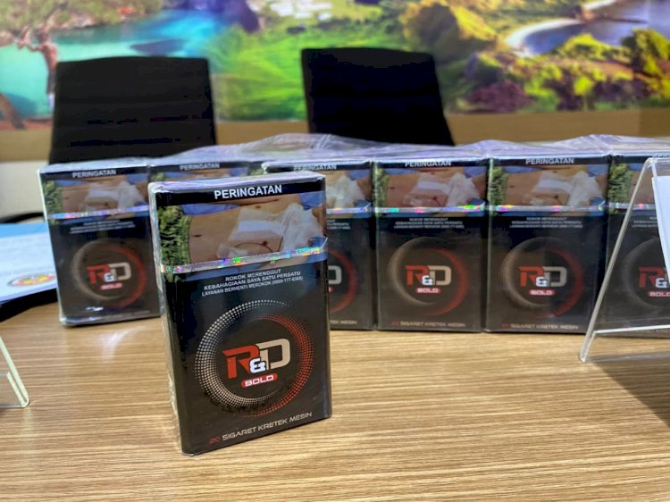 Rokok merek R&D BOLD sebanyak 1.790 bungkus, dengan kemasan berwarna hitam bertuliskan R merah dan &D BOLD putih, serta dua gambar setengah lingkaran berwarna putih dan merah.