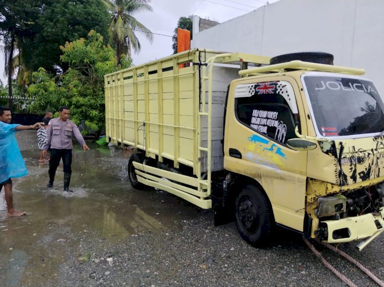 Polsek Amfoang Polres Kupang Bantu Evakuasi Dump Truk Pengangkut Bantuan Pemerintah yang Terjebak Banjir di Sungai Bonpo