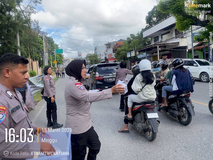 Pembagian takjil dilakukan di sejumlah titik, salah satunya di depan Mapolda NTT, dengan sasaran para pengendara kendaraan bermotor dan masyarakat yang melintas menjelang waktu berbuka puasa.