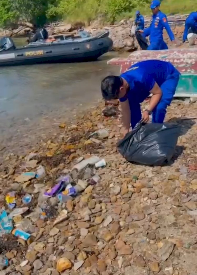 Dalam kegiatan ini, personel Ditpolairud Polda NTT bersama unsur terkait membersihkan berbagai jenis sampah, mulai dari sampah plastik, potongan kayu, hingga dedaunan yang berserakan di sepanjang garis pantai Pulau Monyet.