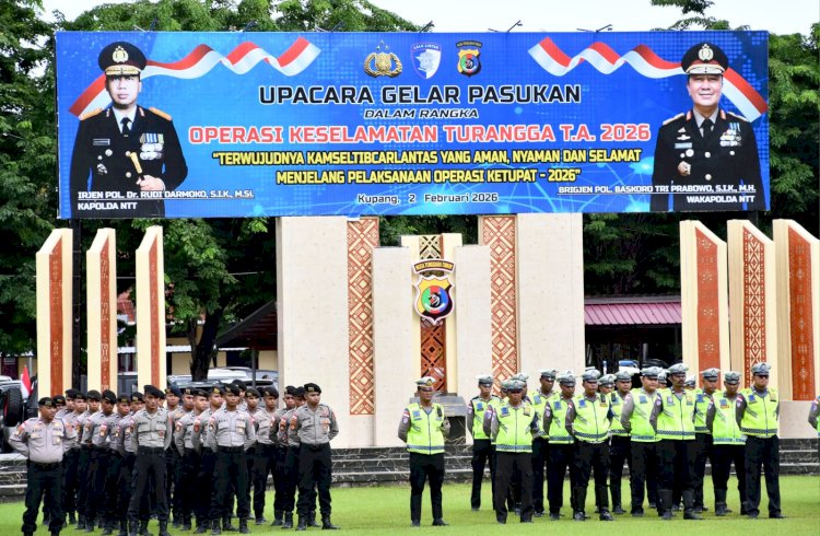 Kupang, NTT – Kepolisian Daerah Nusa Tenggara Timur (Polda NTT) menggelar Apel Gelar Pasukan dalam rangka Operasi Keselamatan Turangga Tahun 2026 dengan tema “Terwujudnya Kamseltibcarlantas yang Aman, Nyaman dan Selamat Menjelang Pelaksanaan Ops Ketupat-2026”. Kegiatan berlangsung di Lapangan Mapolda NTT, Senin (2/2/2026).